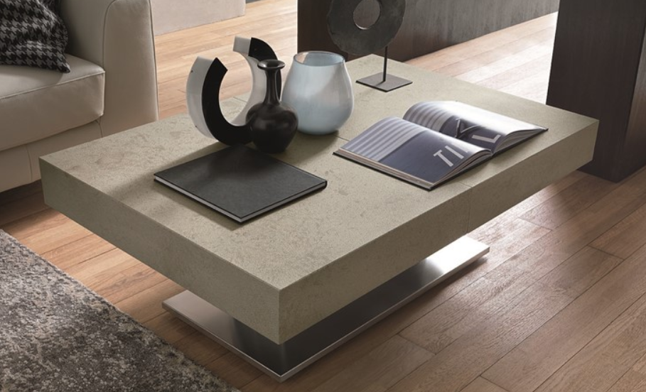 Tavolino trasformabile in tavolo da pranzo, struttura centrale in acciaio, meccanismo a gas regolabile in altezza da cm 41 a cm 76, piano in nobilitato, laccato, legno, effetto malta o ceramica, 2 prolunghe interne e 2 prolunghe esterne. Rotelle piroettanti a scomparsa. Gambe pieghevoli di supporto.
