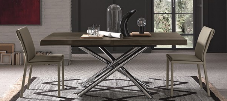 Tavolo da pranzo allungabile. struttura in metallo, piano in nobilitato, legno bordo corteccia o effetto malta, 2 prolunghe interne. Una struttura ad intreccio davvero moderna caratterizza questo tavolo che si presenta come un complemento d'arredo contemporaneo e di gran stile.