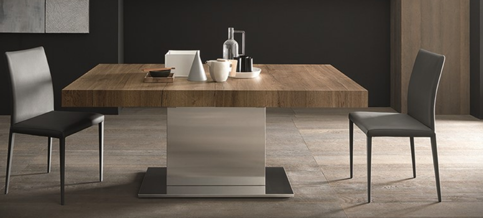 Tavolo da pranzo allungabile, base centrale in metallo, piano in nobilitato, legno o effetto-malta, 6 prolunghe interne, gambe pieghevoli di supporto.  Si tratta di un tavolo allungabile che sa regalare grandi, anzi enormi emozioni. Nella versione da soggiorno è piccolo e discreto, ma quando si apre diventa un tavolo da pranzo di quasi 5 metri di lunghezza.