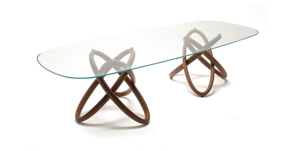 Tavolo con base in massello di noce Canaletto (NC). Piano con piastre in cristallo 15mm trasparente o trasparente extrachiaro con bordo bisellato.