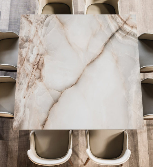 Tavolo con base in acciaio verniciato trasparente (OP0), goffrato titanio (GFM11), bianco (GFM71), nero (GFM73) o graphite (GFM69). Piano in ceramica Marmi nei colori Calacatta (KM01), Alabastro (KM02), Ardesia (KM04), Golden Calacatta opaco (KM05), Golden Calacatta lucido (KM06), Portoro opaco (KM07), Portoro lucido (KM08), Sahara Noir lucido (KM09) o ceramica Brown Zinc (KZ01).