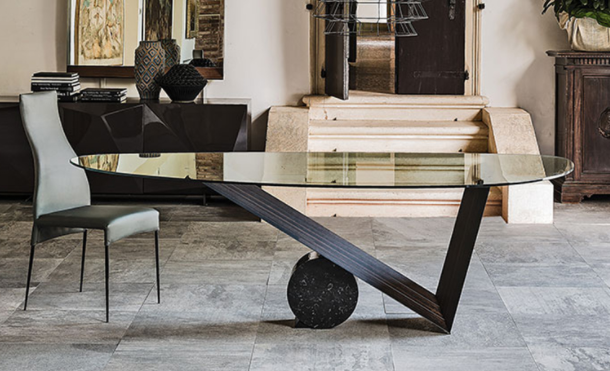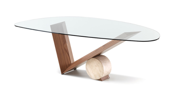 Tavolo con base in noce Canaletto (NC) o rovere bruciato (RB) e cilindro in Travertino (TN), marmo nero Marquina (NM) o bianco Carrara (BC). Piani in appoggio in cristallo trasparente spessore 15mm. Il piano 240Ã115 sagomato ha spessore 12mm.