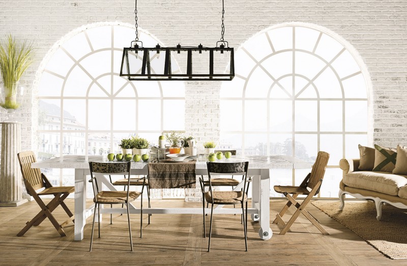 Tavolo con ruote realizzato in legno vecchio riciclato di colore bianco.