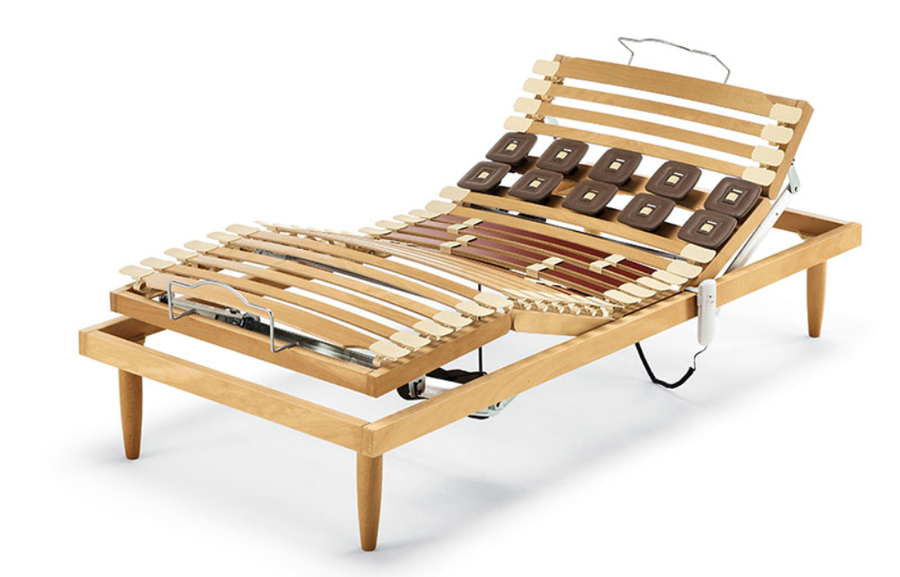 à una rete con doghe regolabili per migliorare la qualità del sonno grazie ai supporti basculanti delle listelle in faggio del piano letto, ai diversi elementi ammortizzanti ad altezza spalle e alle doghe con regolatori di rigidità della zona lombare. Il sistema diventa una rete ergonomica motorizzata per letto singolo o una piazza e mezza, facile da muovere per soddisfare le esigenze del momento e dotato di un sistema dâemergenza, ovvero di una batteria da usare, in caso di mancanza dâelettricità , per riportare la rete in posizione di riposo.