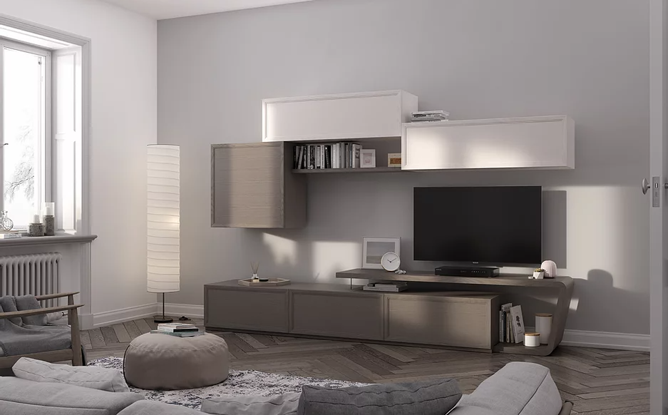 Un segno percorre la linea dei cassetti e ne caratterizza il design. Ricerca del dettaglio ed accostamenti cromatici studiati per un'effetto di grande impatto scenografico. Doppia profondità per gli elementi sospesi che creano un piacevole movimento dei volumi.