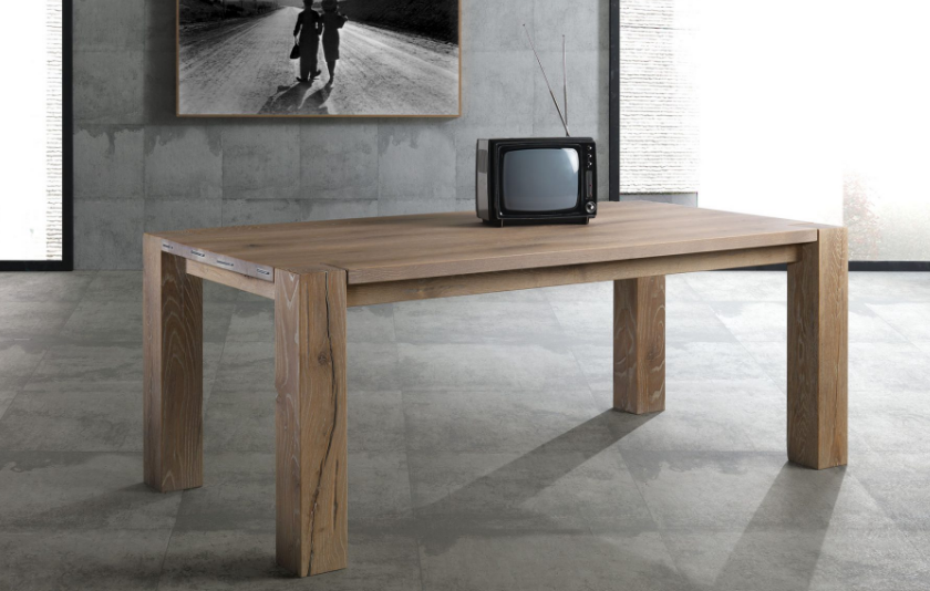 Tavolo massiccio con secche, sgorbiature e ferri di testa, ï¬sso. Nodi e crepe a vista non stuccati. Gamba quadrotto a vista 13,5x13,5 cm, H 77 cm. Disponibile in quercia con gamba a quadrotto. Olmo e noce canaletto solo con gamba lamellare.