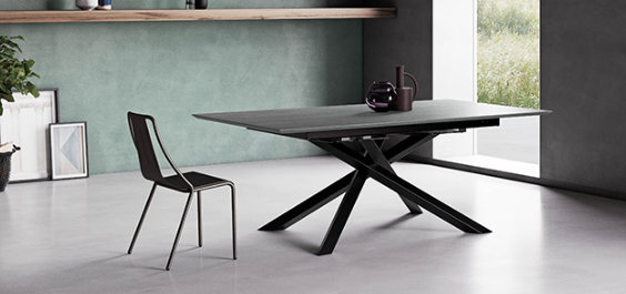 Tavolo impiallacciato allungabile con sistema sincronizzato.