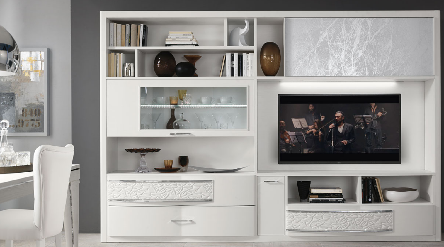 La zona giorno è completa di una parete attrezzata, tavolo e sedie, nella versione colore bianco o cachemire.