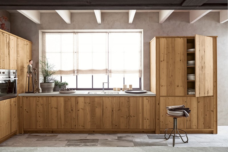 La versione della âMaestraleâ realizzata con assi di legno vecchio, ricavato da demolizioni di vecchi fienili od edifici alpini, dona carattere a questa cucina. Le ante assumono una patina âpreziosaâ, la superficie dei frontali presenta nodi, piccole fessurazioni che conferiscono al tutto un effetto âmagicoâ, semplicemente inimitabile.