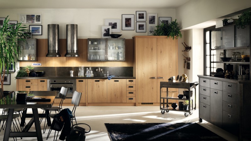 Materiali e finiture esprimono una totale vocazione verso il vissuto: l'acciaio invecchiato, i legni (Rovere nodato Ruxe Wood, Ruxe White, Ruxe Grey) lavorati, per trasmettere alla vista e al tatto un effetto âliveâ, i vetri, dal retino metallico, rafforzano questo concetto retrò, come le maniglie.