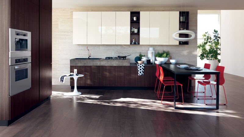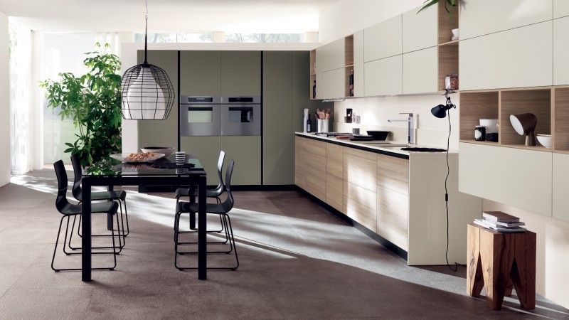 Forme essenziali e volumi geometrici per uno spazio cucina che diventa il cuore di una casa moderna. Stile e colori (Visone per le ante laccate lucide, Avorio per gli elementi a giorno laccati lucidi e per i pensili a vetro) privilegiano il rigore formale, associato ad una massima funzionalità .
