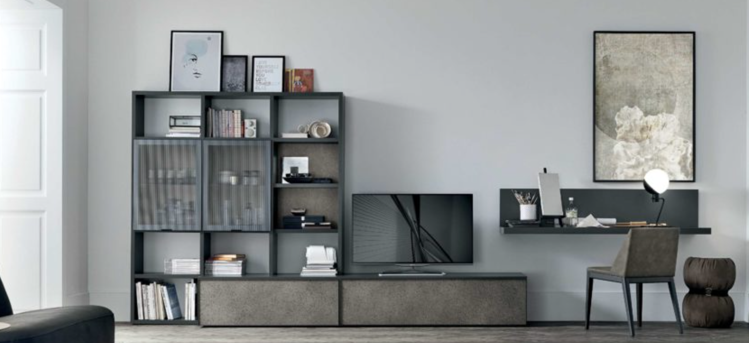 La finitura graniglia riveste il cestone Vinci con profilo in metallo e ritorna sulla schiena della libreria per un effetto coordinato.