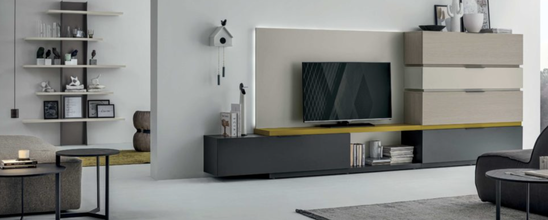 Finiture della foto / Materico frassino oriente, materico opaco madreperla, materico opaco antracite, laccato opaco zafferano 158 e metallo antracite.