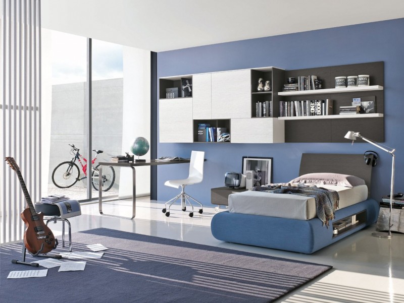 Composizione T04 L. 360 P. 230 H. 212 cm. Contenitori in laccato poro aperto bianco gesso 221. Librerie BIBLO orizzontali, boiserie e comodino su ruote in laccato poro aperto piombo 229. Letto GINGER rivestito in tessuto cat. B, var. hermes, col. 28. Testiera e libreria In laccato poro aperto piombo 229