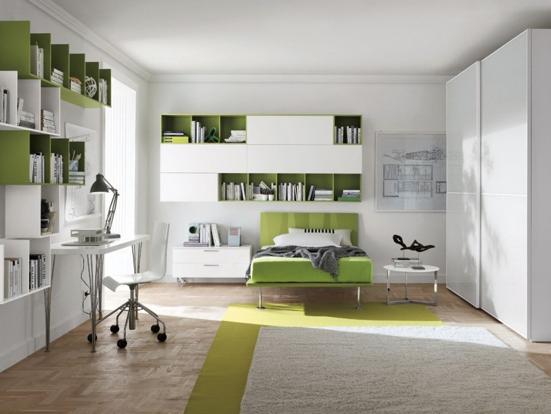 Composizione T05 L. 252 P. 210 H. 210 cm. Armadio L. 281,2 P. 67,1 H. 255 cm. Contenitori in laccato opaco bianco gesso 121. Libreria BIBLO orizzontale in laccato opaco bianco gesso 121 e oliva 147. Letto ORIGAMI 1p e ½ in laccato opaco oliva 147. Armadio anta 2 settori con vetro laccato bianco gesso
