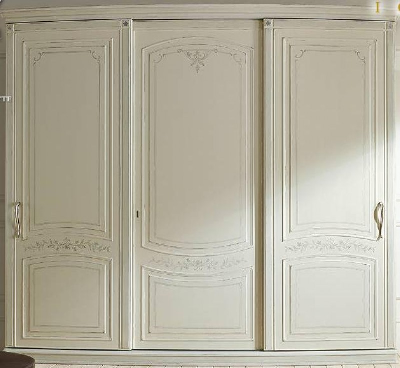 Armadio a 3 ante scorrevoli su binari curvi. Finiture e decori realizzati rigorosamente a mano. Struttura in legno tamburato di compensato. Le finiture e i decori sono realizzati rigorosamente a mano. Interno verniciato in noce tanganika, schienali in multistrati di spessore 6 mm e cornici in legno. Maniglie in ottone.Meccanismo scorrevole con ruote su cuscinetti.