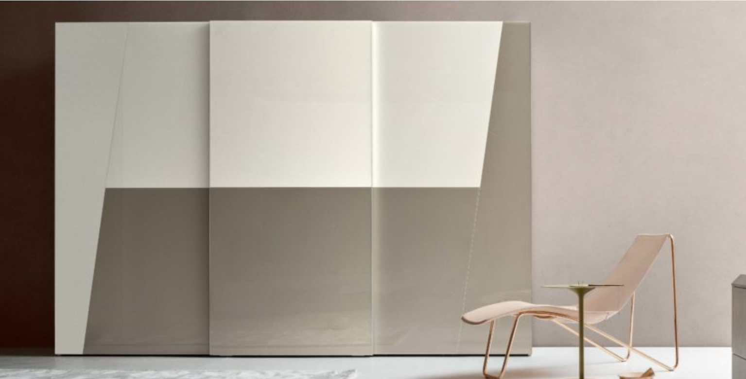 Forme geometriche e vetri colorati lucidi abbinati insieme, per dare vita ad un anta personalizzabile nella forma e nel colore. Finiture della foto / Armadio anta Kaori in materico opaco bianco gesso, vetro lucido bianco gesso 321 e hot 327.