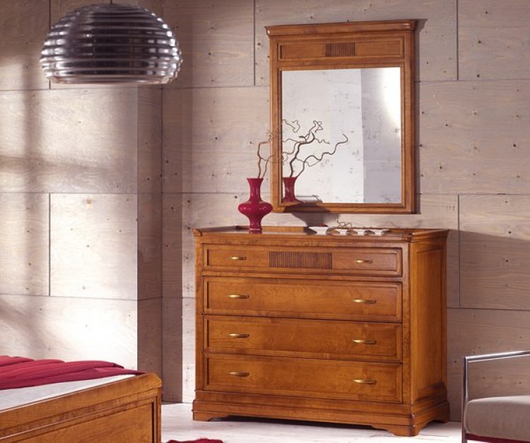 Comò 4 cassetti laccato bicolore arancio/nero. Finitura ciliegio.
