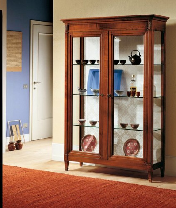 Vetrina con 2 ante vetro. Schienale tappezzato. Finitura ciliegio.