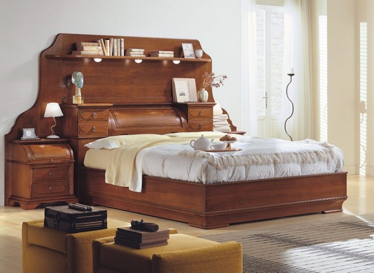 Letto matrimoniale con segreti laterali estraibili, completo di attrezzatura con pannello sagomato, mesola e kit 3 faretti. Finitura noce.