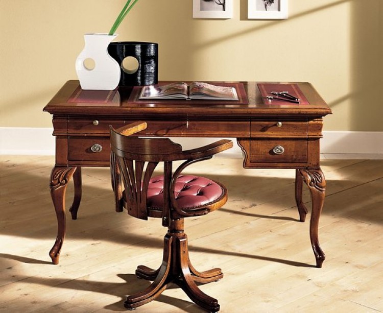 Scrittoio 5 cassetti con piano in pelle e bordi dorati. Finitura noce.