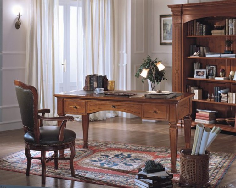 Scrittoio intarsiato con piano pelle, bordi dorati e gambe sfaccettate. Finitura noce.
