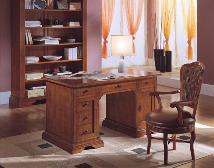 Scrivania 1 anta e 6 cassetti. Rifinita su 4 lati. Finitura noce.