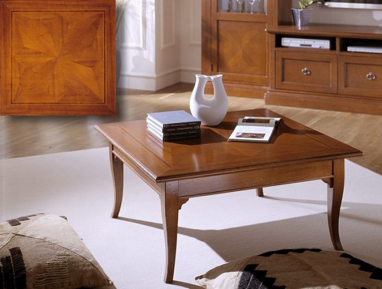 Tavolino da salotto quadrato con gambe a sciabola.