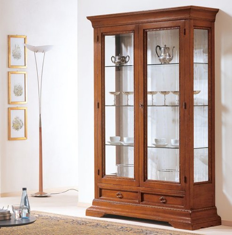 Vetrina 2 ante dritta con 2 cassetti sotto. Finitura noce.