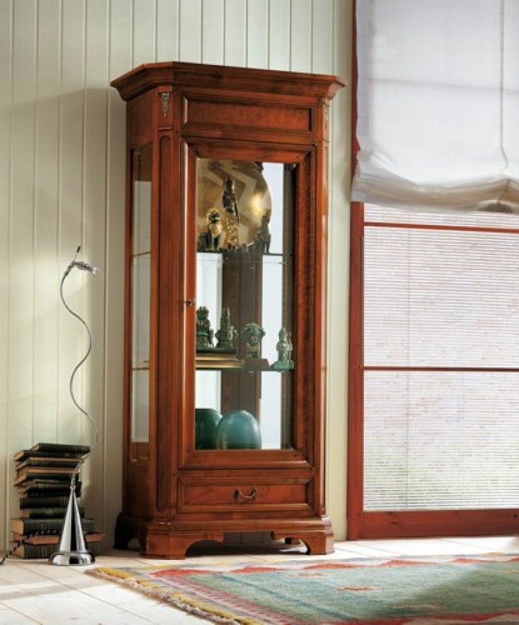 Vetrina 1 anta in vetro e cassetto sotto. Finitura in ciliegio.