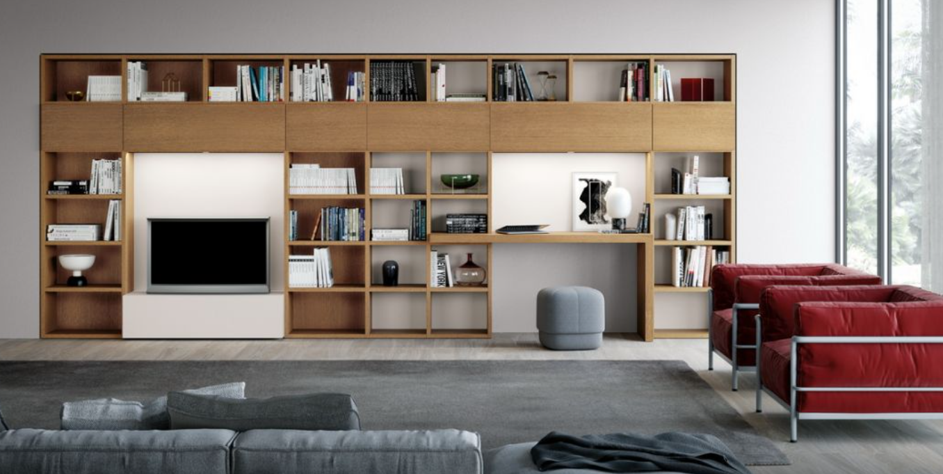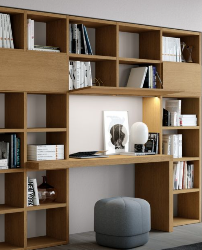 Lo scrittoio, disponibile in varie finiture e tipologie convive perfettamente con la struttura, diventando così parte integrante della zona giorno.