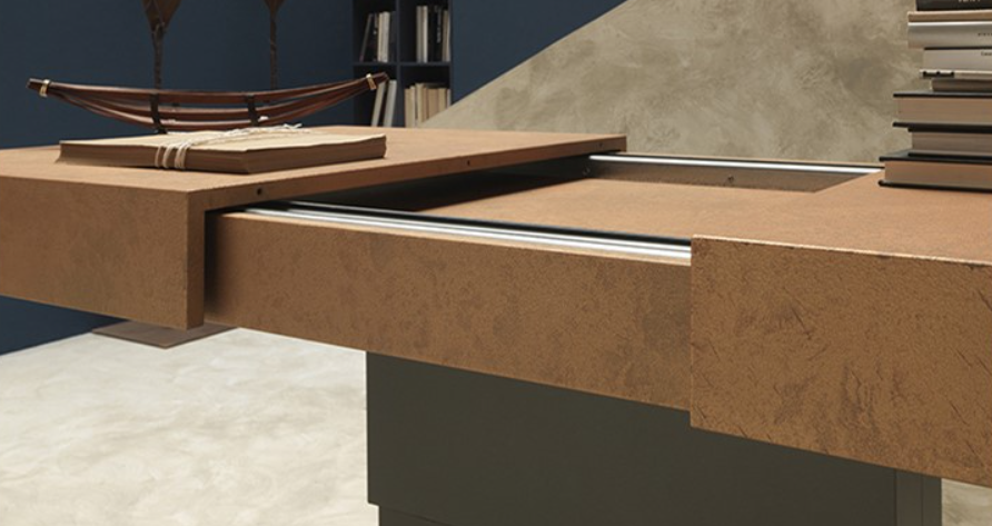 Tavolino trasformabile in tavolo da pranzo, struttura centrale in acciaio, meccanismo a gas regolabile in altezza al millimetro da cm 41 a cm 82, piano rettangolare nobilitato, laccato, legno, effetto malta o ceramica, 2 prolunghe interne. Rotelle piroettanti a scomparsa.