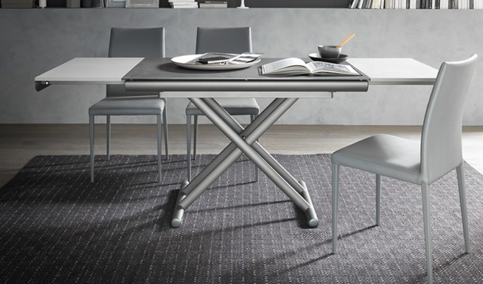 Tavolino trasformabile Etoile in tavolo da pranzo, base in metallo, meccanismo a gas, regolabile in altezza al millimetro da cm 27 a cm 86, piano in vetro o ceramica, allunghe laterali a libro in nobilitato millerighe Silver. Ruote a scomparsa.