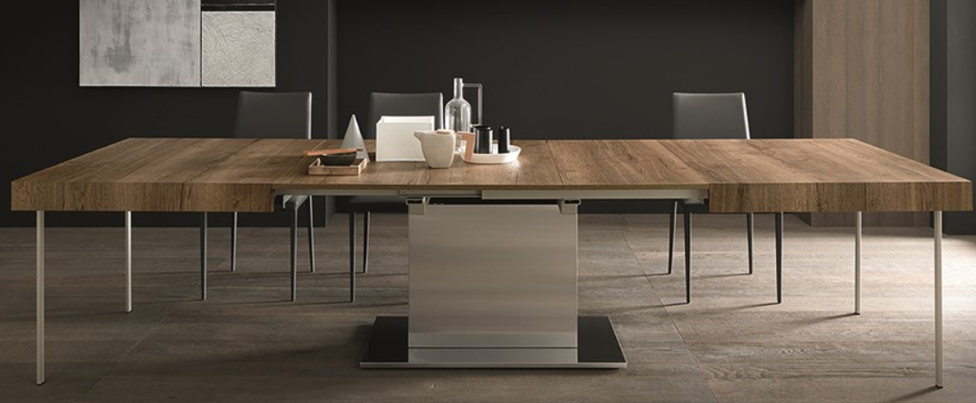 Tavolo da pranzo allungabile, base centrale in metallo, piano in nobilitato, legno o effetto-malta, 6 prolunghe interne, gambe pieghevoli di supporto.  Si tratta di un tavolo allungabile che sa regalare grandi, anzi enormi emozioni. Nella versione da soggiorno è piccolo e discreto, ma quando si apre diventa un tavolo da pranzo di quasi 5 metri di lunghezza.