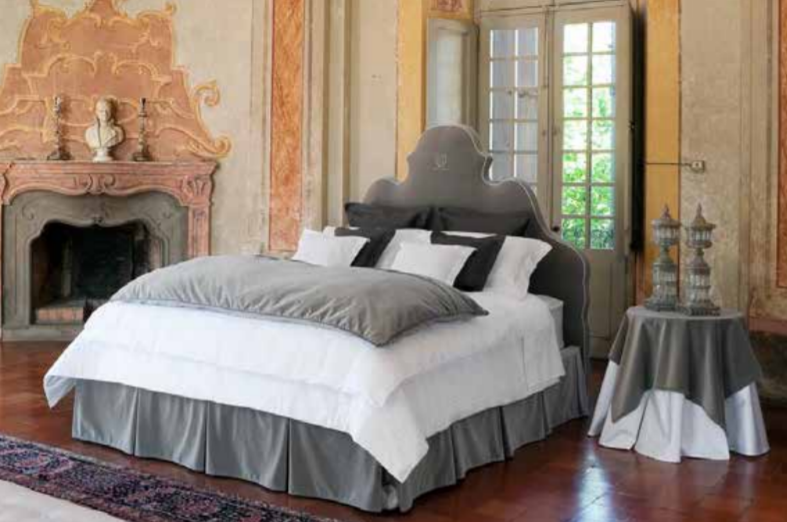 Country Living Six è un letto con testiera e base gonnellino con particolari in pelle rigenerata completamente sfoderabili, Logo CL ricamato;