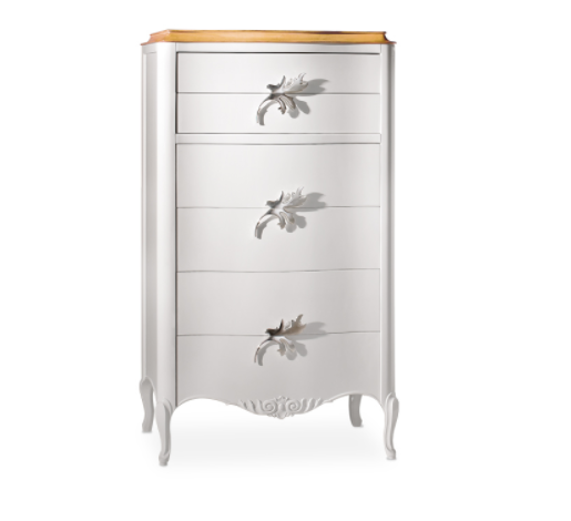 Cassettiera Gala con arricchita con intagli in altorilievo e un manico a forma di foglia, Gala Chiffoner è un pezzo delicato ma intricato che aggiunge grazia e stile a qualsiasi camera da letto classica.