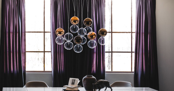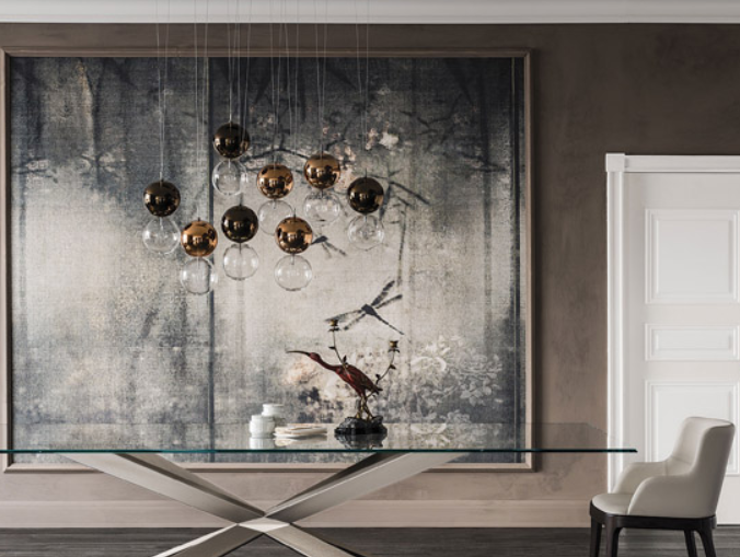 Lampada a soffitto con paralume composto da 2 sfere in vetro borosilicato. Sfera inferiore in vetro trasparente e sfera superiore verniciata cromo, rame, bronzo o trasparente. Attacco a soffitto in acciaio cromato. 1: attacco singolo. 5: attacco rettangolare per 5 paralumi. 8R: attacco rotondo per 8 paralumi. 8oval: attacco ovale per 8 paralumi. Lampadina non inclusa nella versione a 110V.