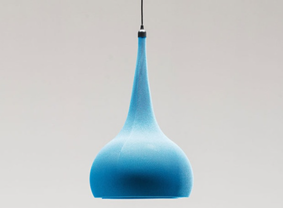Lampada da soffitto e da terra con rivestimento in maglia elasticizzata nei colori cenere, smoke, graphite, nero o blu. Versione da soffitto con struttura in metacrilato fumé. Lampada da terra con struttura in acciaio e metacrilato fumé, base in acciaio verniciato goffrato nero (GFM73). Lampadina non inclusa