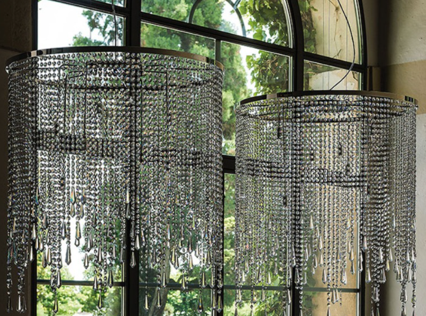 Lampade da soffitto, parete e da terra con telaio in acciaio cromato (08); paralume composto da pendagliere in cristallo. Lampadine incluse.