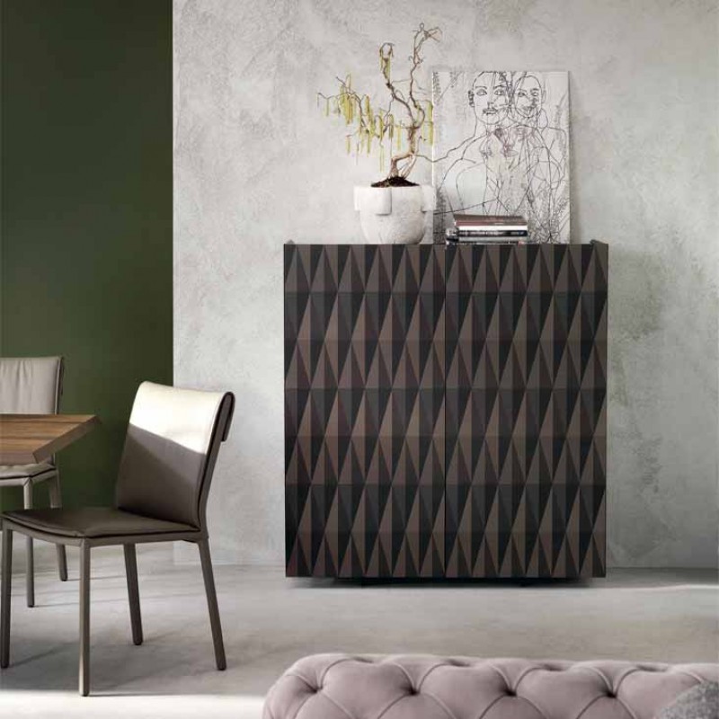 Madia a due o quattro ante in acero serigrafato con motivi geometrici. Top in cristallo extrachiaro verniciato graphite. Piedi in acciaio verniciato goffrato nero.
