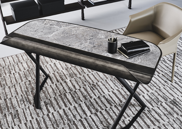 Scrittoio con base in acciaio verniciato goffrato titanio (GFM11), bronzo (GFM18) o nero (GFM73). Piano in ceramica Marmi nei colori Calacatta (KM01), Alabastro (KM02), Ardesia (KM04), Golden Calacatta opaco (KM05), Golden Calacatta lucido (KM06), Portoro opaco (KM07), Portoro lucido (KM08), Sahara Noir lucido (KM09), Emperador (KM10), Makalu (KM11), Breccia (KM12), Arenal (KM13) o Zefiro (KZ20) con profilo inferiore arrotondato e verniciato Brushed Bronze o Brushed Grey e gola portaoggetti in metallo verniciato Brushed Bronze o Brushed Grey.