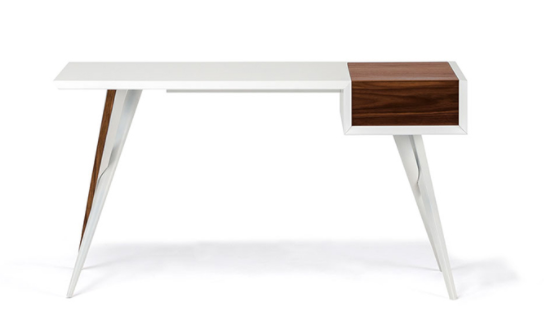 Scrittoio con gambe in acciaio verniciato goffrato bianco (GFM71) o graphite (GFM69) con inserti in noce Canaletto (NC). Piano in legno verniciato goffrato bianco (GF71) o graphite (GF69) con contenitore in noce Canaletto (NC).