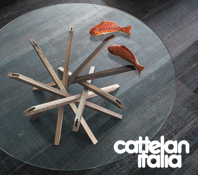 Tavolino con base in massello di noce Canaletto (NC) o noce tinto rovere bruciato (RB). Piano in appoggio in cristallo trasparente.