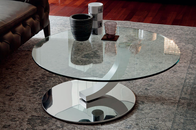 Tavolino con base in acciaio inox lucido. Uno o due piani girevoli in cristallo trasparente. Piedi in faggio tinto noce Canaletto (FNC), wenghè (FW), bianco (OP7) o nero (OP17).