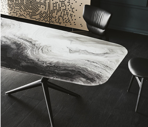 Tavolo con base in acciaio verniciato goffrato titanio (GFM11), graphite (GFM69) o nero (GFM73). Piano in cristallo 12mm extrachiaro bisellato con stampa artistica decorativa.