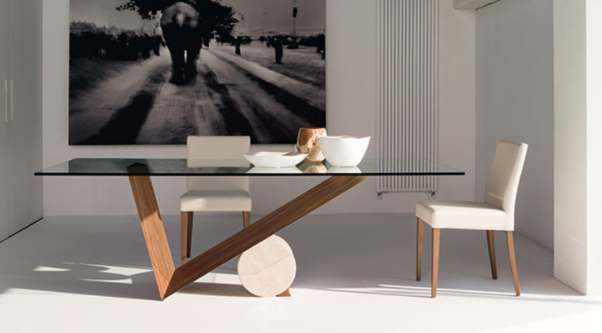 Tavolo con base in noce Canaletto (NC) o rovere bruciato (RB) e cilindro in Travertino (TN), marmo nero Marquina (NM) o bianco Carrara (BC). Piani in appoggio in cristallo trasparente spessore 15mm. Il piano 240Ã115 sagomato ha spessore 12mm.