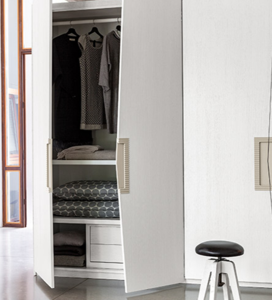 Il grande armadio ad ante scorrevoli, di linea rigorosa, è in legno massello come tutti i mobili della collezione Zero.16.