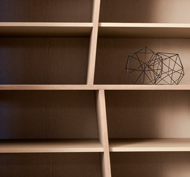 La discontinuità presentata dalle ante asimmetriche ammorbidisce il rigore degli spazzi , mentre la sequenza orizzontale e verticale del legno intagliato si alterna secondo uno schema prestabilito.