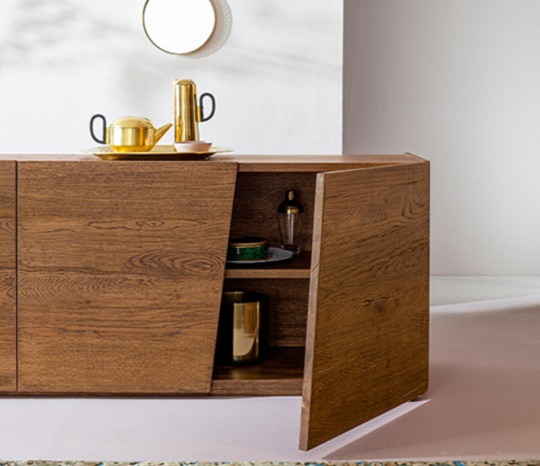 Al 100% in Rovere massello, esibisce con fierezza la sua natura: le venature del legno scorrono senza interruzioni su tutto il frontale, attraversando le linee diagonali delle ante.