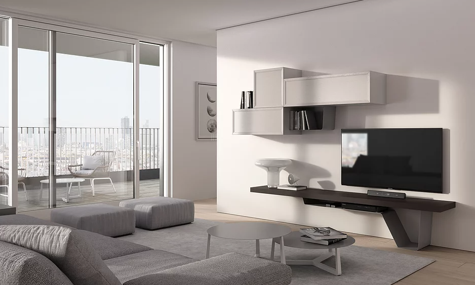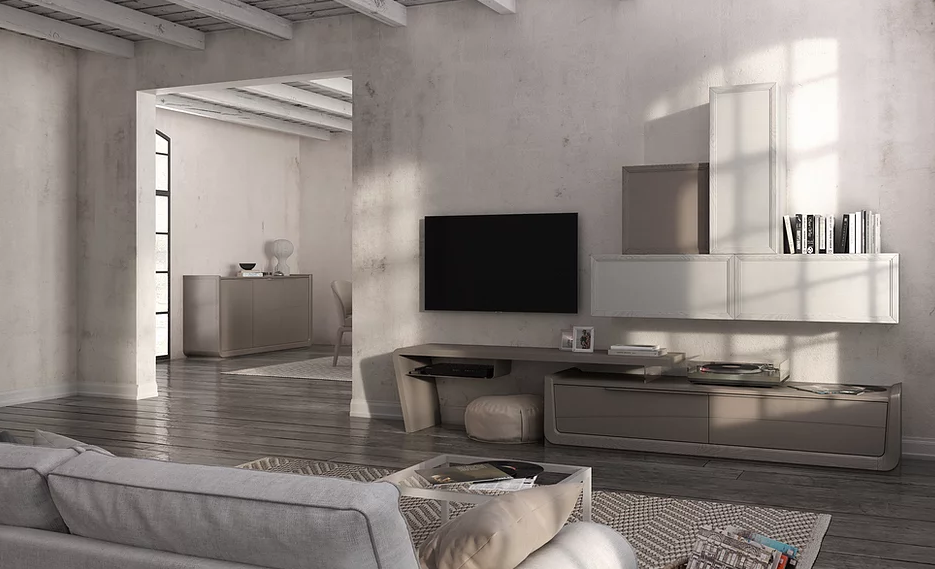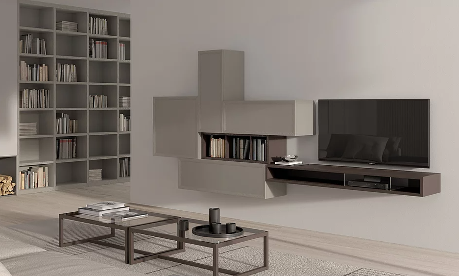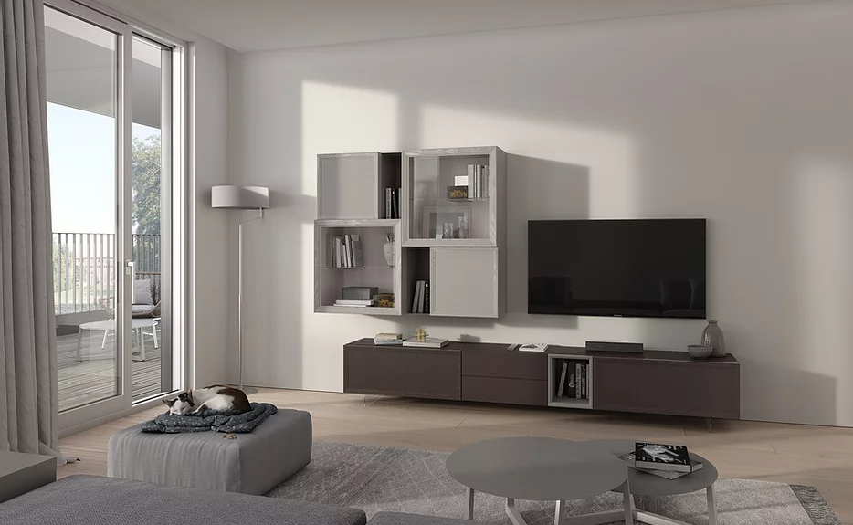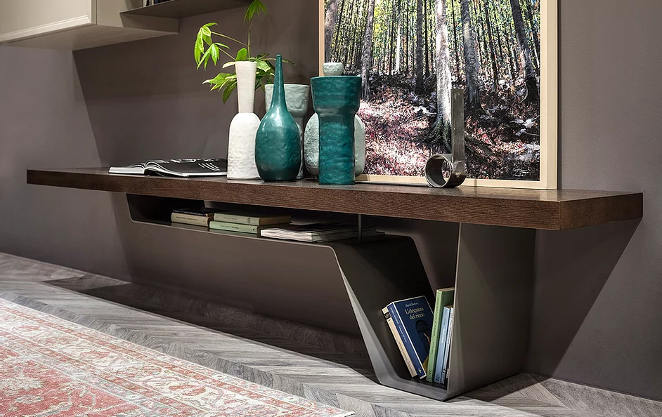 Un segno percorre la linea dei cassetti e ne caratterizza il design. Ricerca del dettaglio ed accostamenti cromatici studiati per un'effetto di grande impatto scenografico. Doppia profondità per gli elementi sospesi che creano un piacevole movimento dei volumi.
